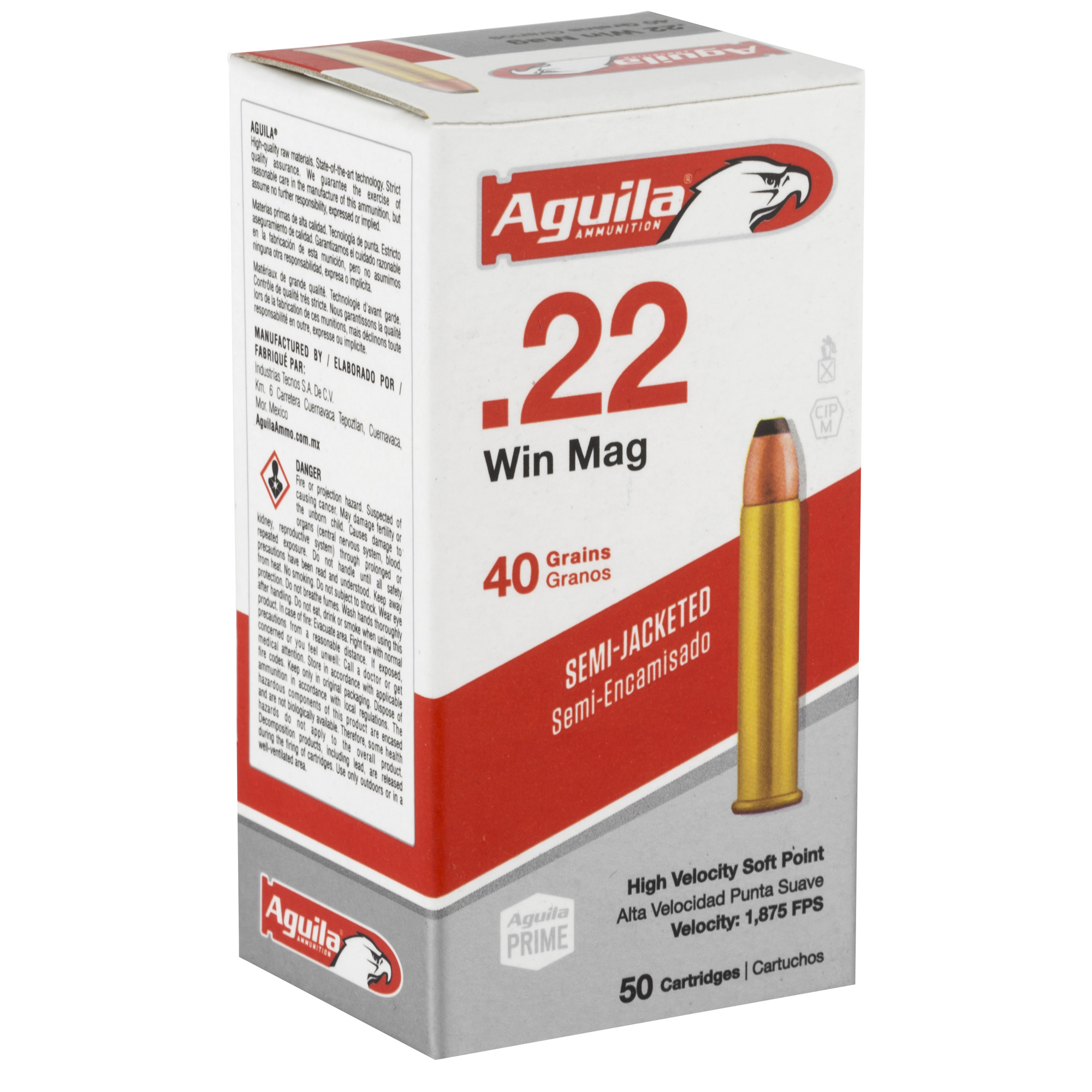 ATTRIBUTES: 22 WMR, 40Gr, Aguila Ammunition, Rimfire, Soft Point, 50, 1000