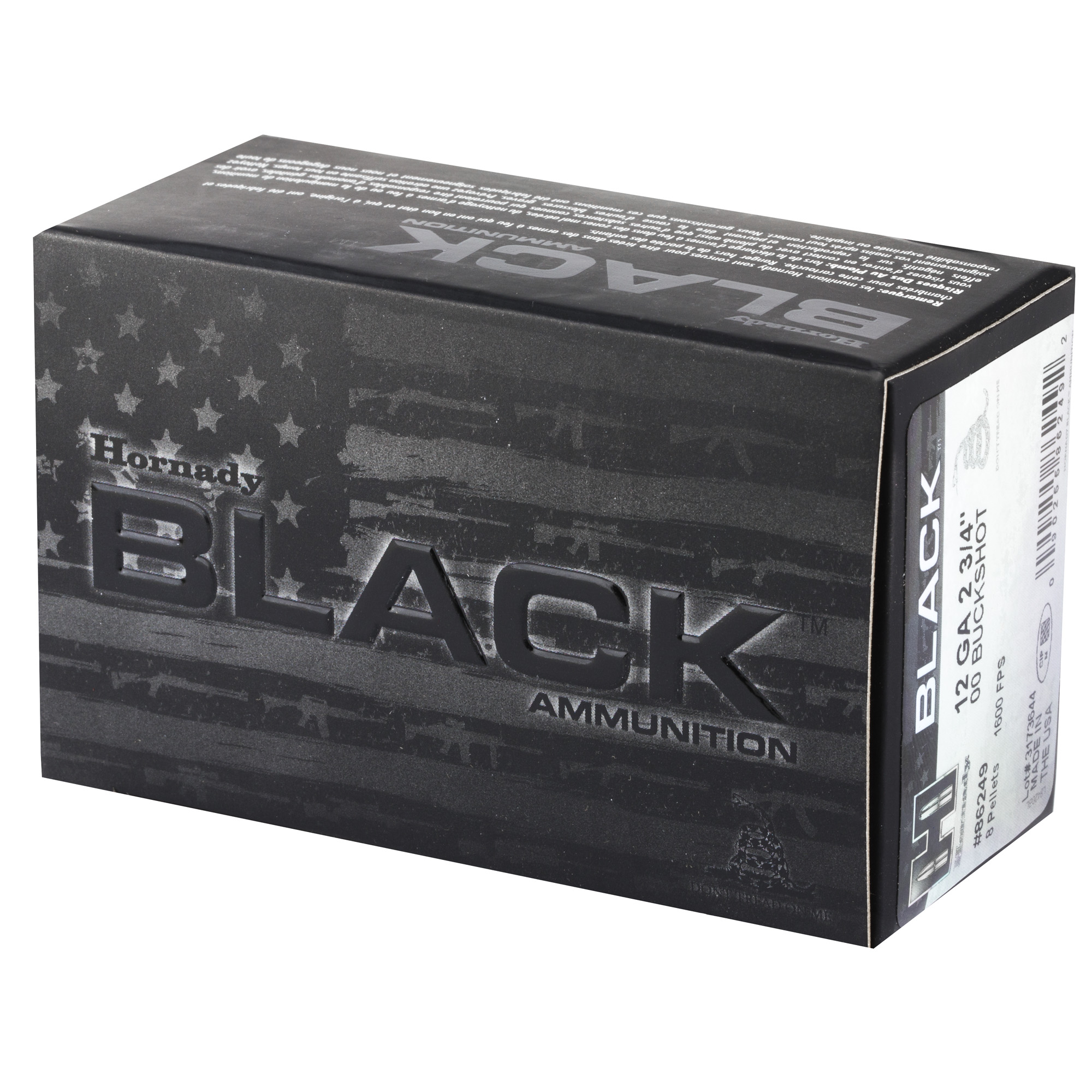 ATTRIBUTES: 12 Gauge 2.75, 00 Buck, Hornady, BLACK, Buckshot, 10, 100