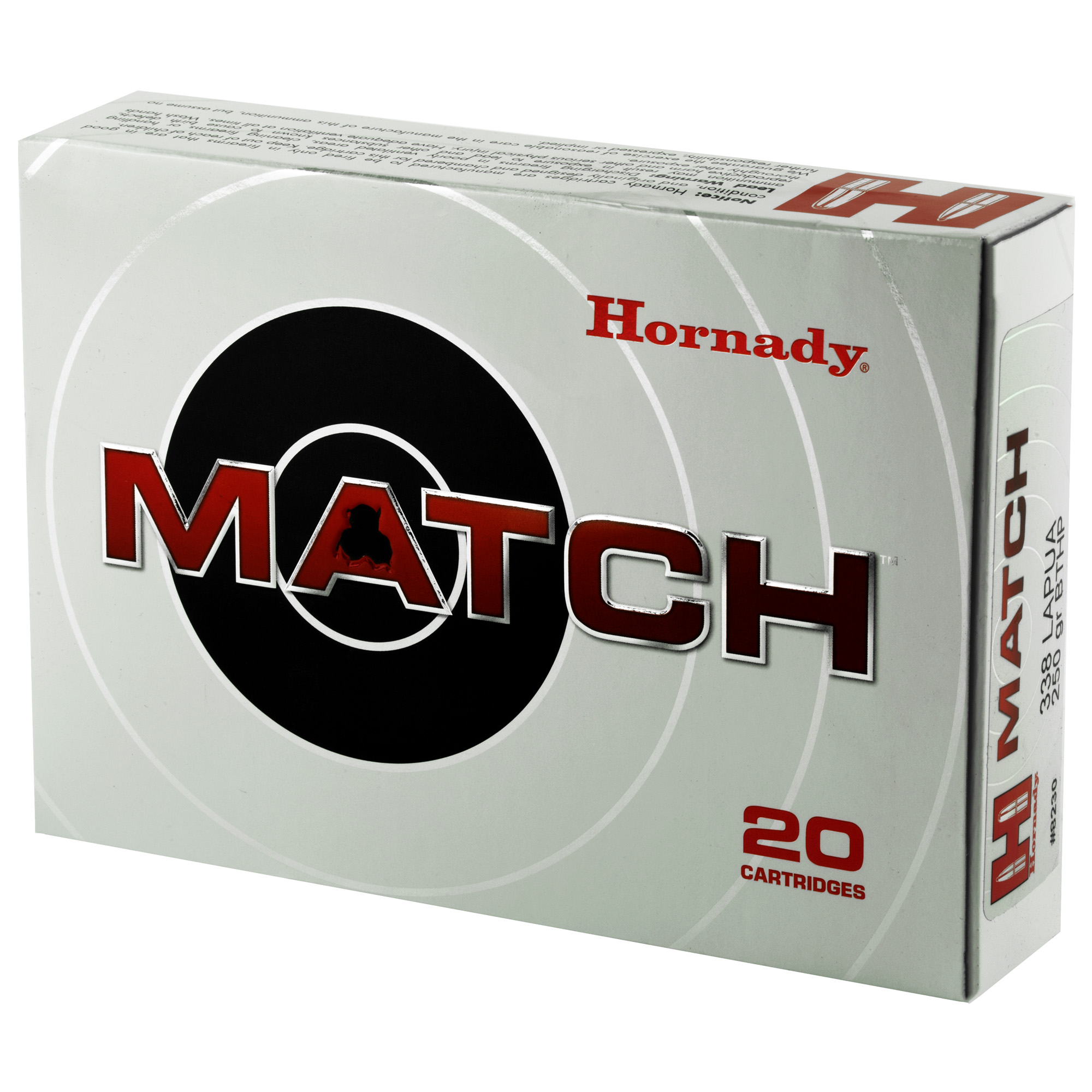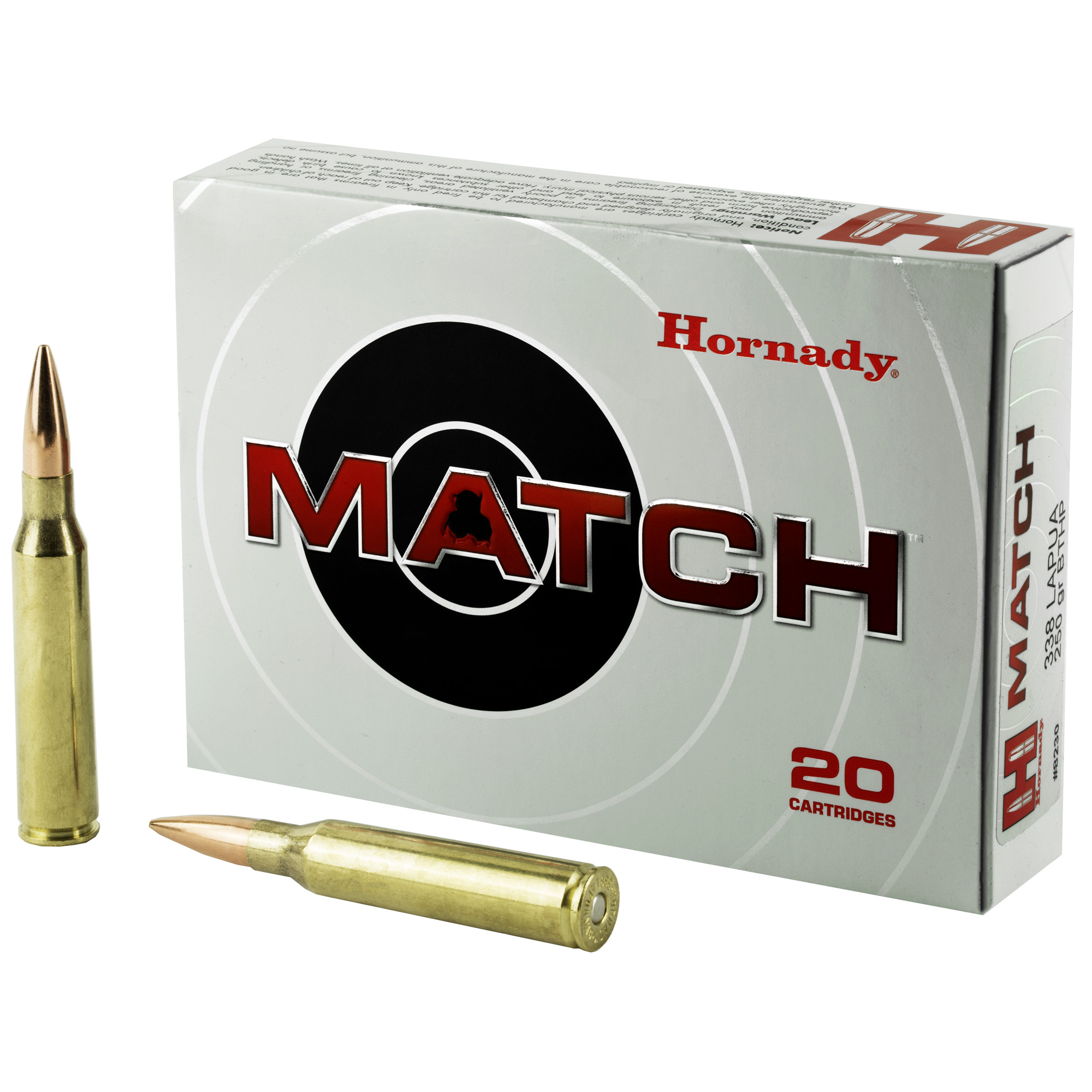 ATTRIBUTES: 338 Lapua, 250Gr, Hornady, Match, Boat Tail Hollow Point, 20, 120