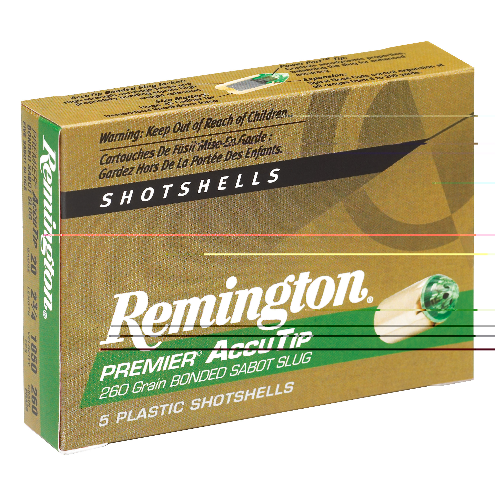 It doesnt just look intimidating, its flattening whitetails and competitors in the tipped-slug market with devastating ferocity. Guided by Remingtons new Power Port Tip, AccuTip Sabot Slugs deliver a degree of accuracy and terminal performance unmatched by any other they tested. This masterpiece of aerodynamics consistently prints tiny 100-yard groups and transfers tremendous knockdown force to the farthest reaches of shotgun range. Its the largest tipped slug youll find anywhere. In field testing, these huge .58-caliber slugs produced gaping wound channels and crumpled every deer it touched with a single shot. From 5 to 200 yards, it yields perfect mushrooms and over 95% weight retention thanks to its spiral nose cuts and high-strength cartridge brass jacket. Designed for rifled barrels only. Available in 23/4″ or 3″ 12-gauge and 20-gauge versions.