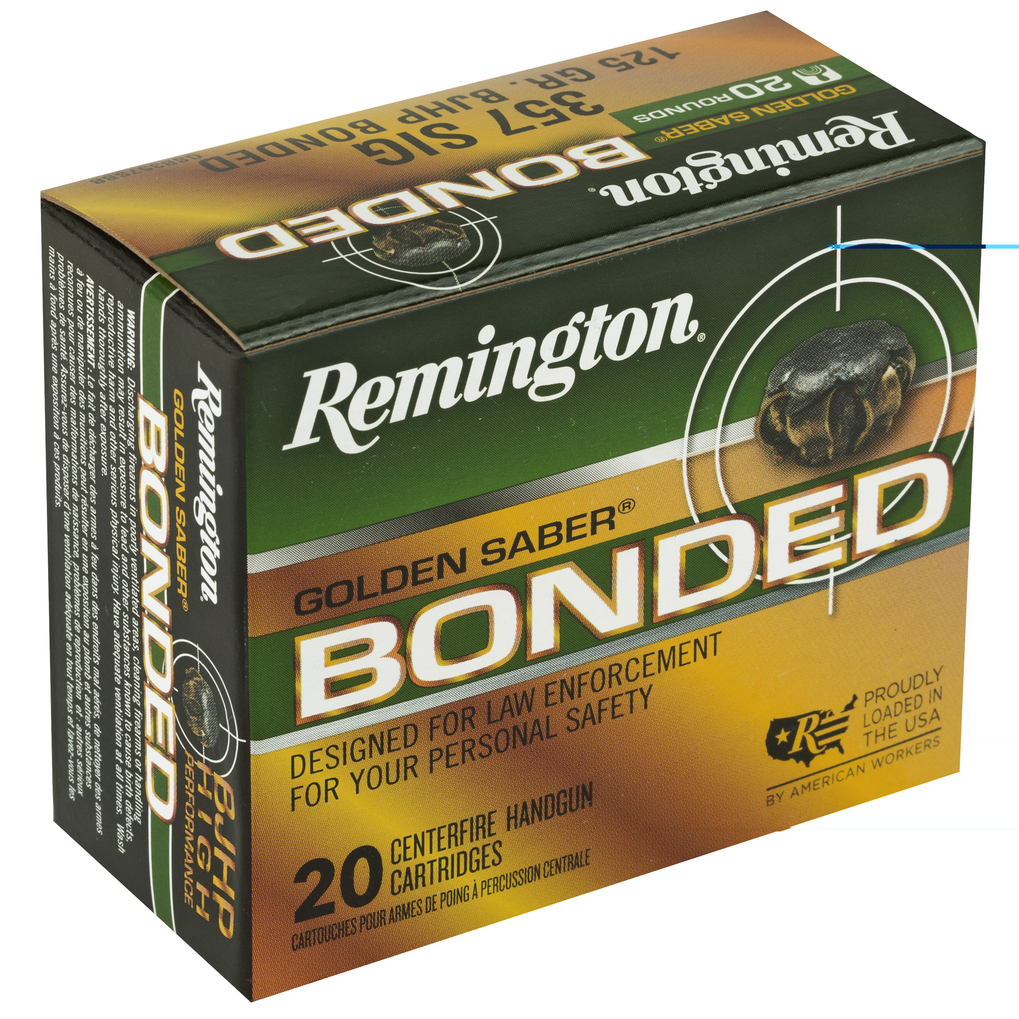 Formerly a law enforcement only product, Golden Saber Bonded is now available to the public. The ultimate in defensive and tactical handgun ammunition, these rounds utilize exclusive technology to produce match-grade accuracy and optimal terminal performance. Improving on trusted Golden Saber, Golden Saber Bondeds reduced bullet nose diameter, optimized jacket thickness, and Remington bonded-bullet manufacturing process produces unmatched expansion, weight-retention and barrier-blind performance to keep you safe.