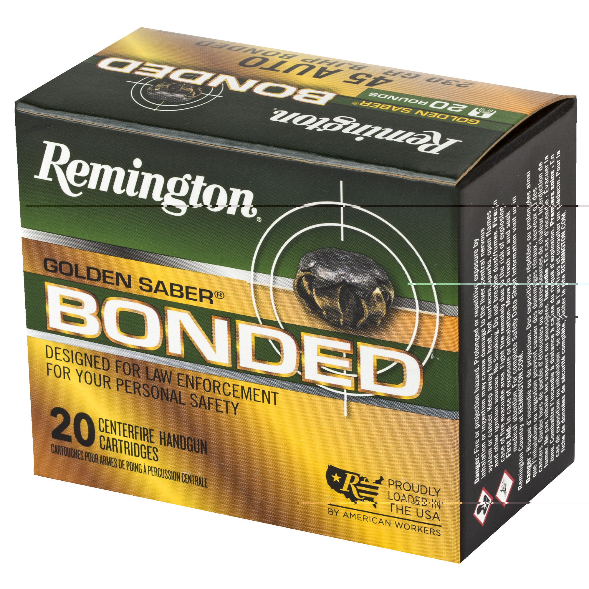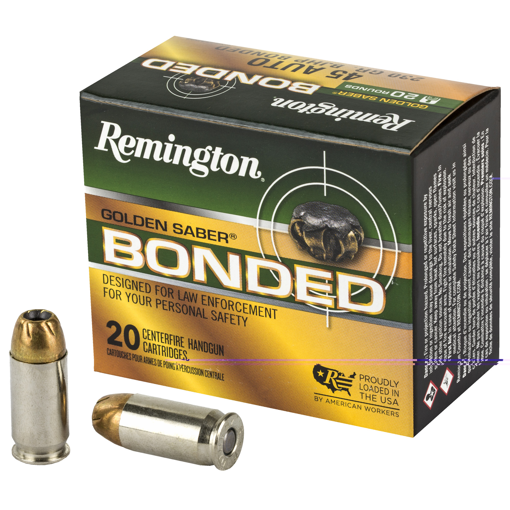 Formerly a law enforcement only product, Golden Saber Bonded is now available to the public. The ultimate in defensive and tactical handgun ammunition, these rounds utilize exclusive technology to produce match-grade accuracy and optimal terminal performance. Improving on trusted Golden Saber, Golden Saber Bondeds reduced bullet nose diameter, optimized jacket thickness, and Remington bonded-bullet manufacturing process produces unmatched expansion, weight-retention and barrier-blind performance to keep you safe.