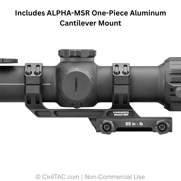 The Sig Sauer Tango MSR Rifle Scope 1-6x24mm BDC10 SFP includes the ALPHA-MSR cantilevered mount, precision-machined from lightweight aluminum for a secure and repeatable fit on Picatinny rails. The included mount is factory-matched for proper height and forward offset, ensuring optimal eye relief and perfect alignment for AR-style platforms.