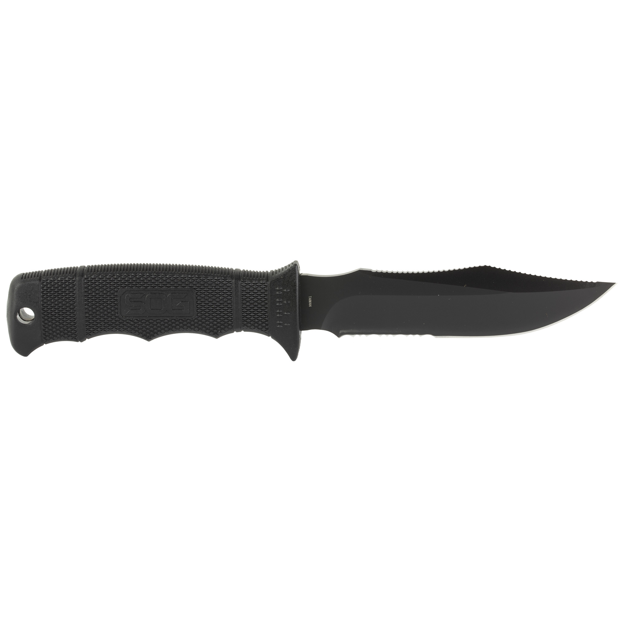 ATTRIBUTES: 50/50: Plain/Serrated, SOG Knives & Tools, Seal Pup, Box, 4.85, Fixed Blade Knife, Black, AUS 8, Black