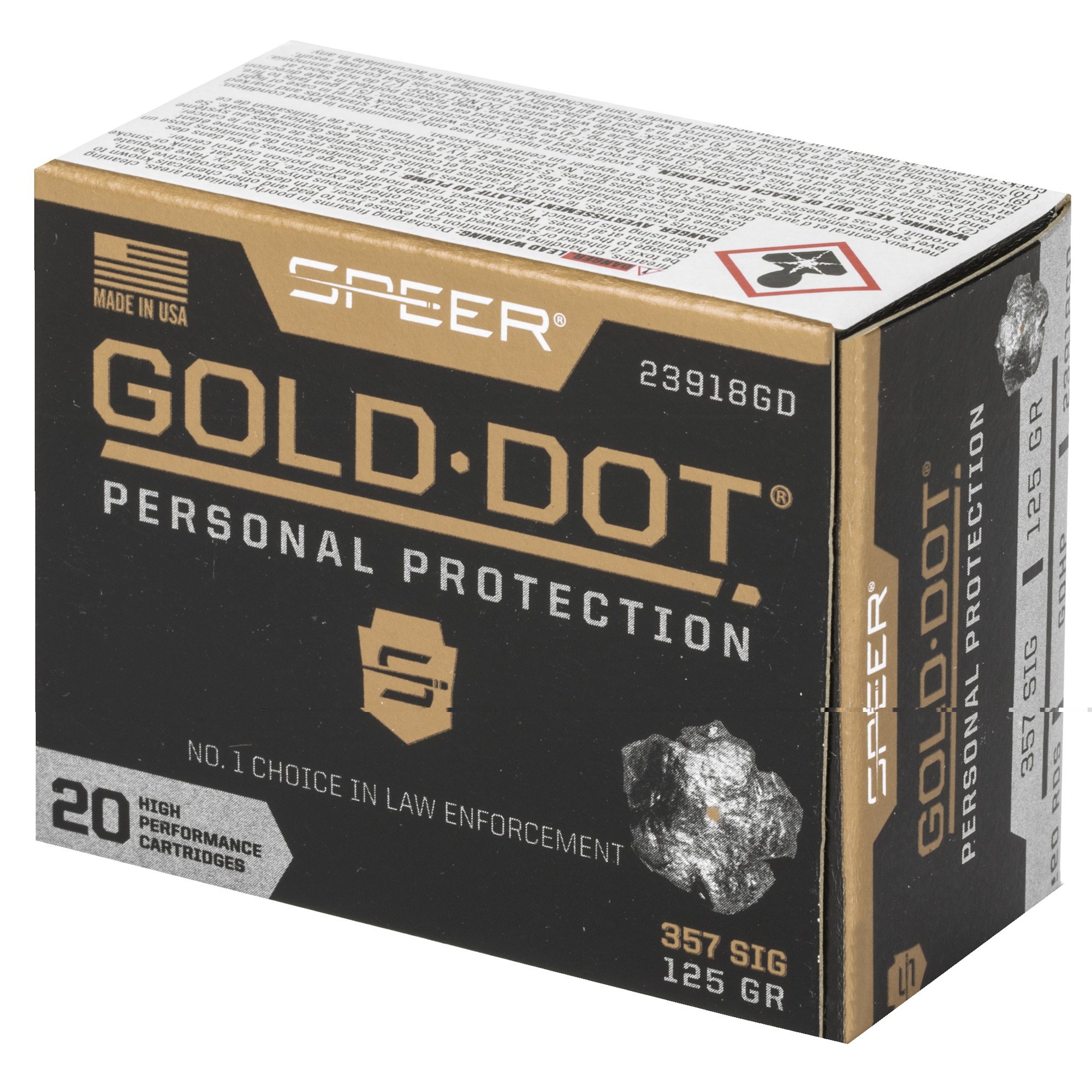 Gold Dot was the first handgun ammunition loaded with true, bonded-core bullets. Using an exclusive Uni-Cor method, Speer bonds the jacket to the core one molecule at a time at the very beginning of the bullet construction process. This virtually eliminates core-jacket separation. With options for both standard handguns and short barrels, theres a Gold Dot load to fit any shooter. Each Gold Dot hollow point cavity is tuned by specific caliber and bullet weight to ensure optimum performance. Speer forms the hollow point cavity in two stages. The first establishes how far the bullet can expand; the second controls the rate of expansion. This patented two-step cavity formation gives Speer engineers incredible control in the design process. Each bullet caliber and weight is tuned for optimum expansion and penetration. The bullet is then finished to provide a smooth profile for reliable feeding in semi-automatic handguns. To ensure Gold Dot performs when you need it most, they first make sure it excels in the stringent tests developed by the Federaleral Bureau of Investigation for service-class handgun cartridges. These protocol tests evaluate penetration, expansion and retained weight in bare gelatin and gelatin shielded by common barriers.