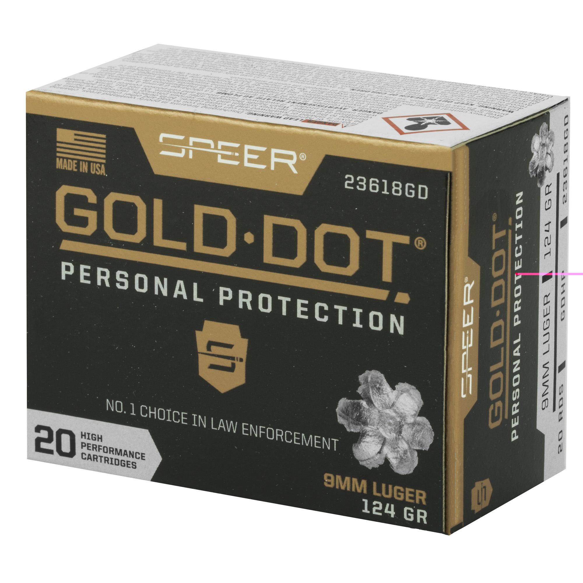 Gold Dot was the first handgun ammunition loaded with true, bonded-core bullets. Using an exclusive Uni-Cor(R) method, Speer bonds the jacket to the core one molecule at a time at the very beginning of the bullet construction process. This virtually eliminates core-jacket separation. With options for both standard handguns and short barrels, theres a Gold Dot load to fit any shooter. Each Gold Dot hollow point cavity is tuned by specific caliber and bullet weight to ensure optimum performance. Speer forms the hollow point cavity in two stages. The first establishes how far the bullet can expand; the second controls the rate of expansion. This patented two-step cavity formation gives Speer engineers incredible control in the design process. Each bullet caliber and weight is tuned for optimum expansion and penetration. The bullet is then finished to provide a smooth profile for reliable feeding in semi-automatic handguns. To ensure Gold Dot performs when you need it most, they first make sure it excels in the stringent tests developed by the Federaleral Bureau of Investigation for service-class handgun cartridges. These protocol tests evaluate penetration, expansion and retained weight in bare gelatin and gelatin shielded by common barriers.