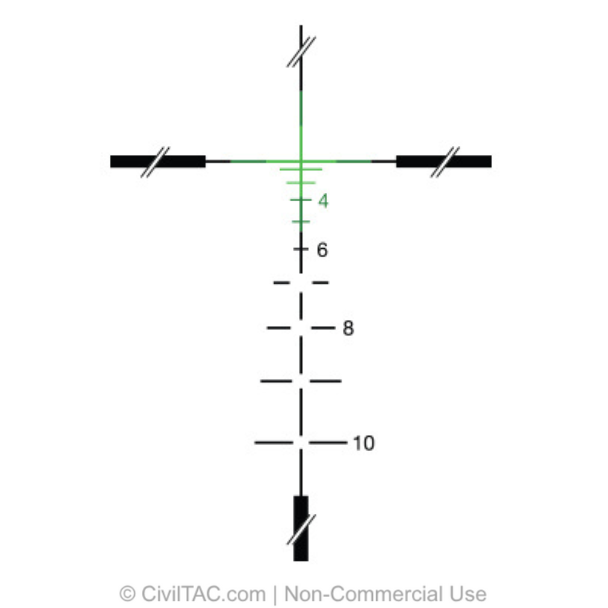 Chevron BDC reticle calibrated for .223/5.56 for fast, accurate holdovers.