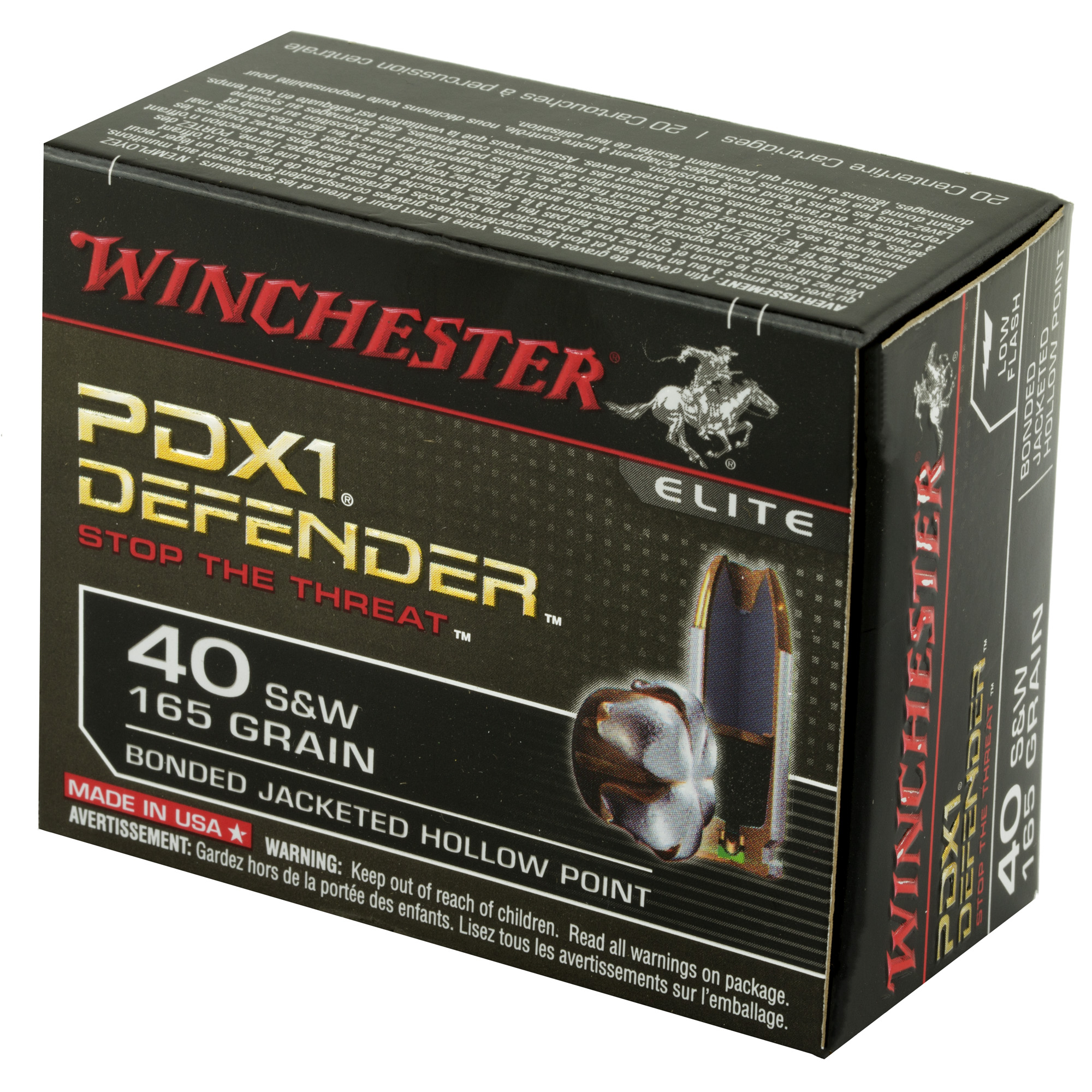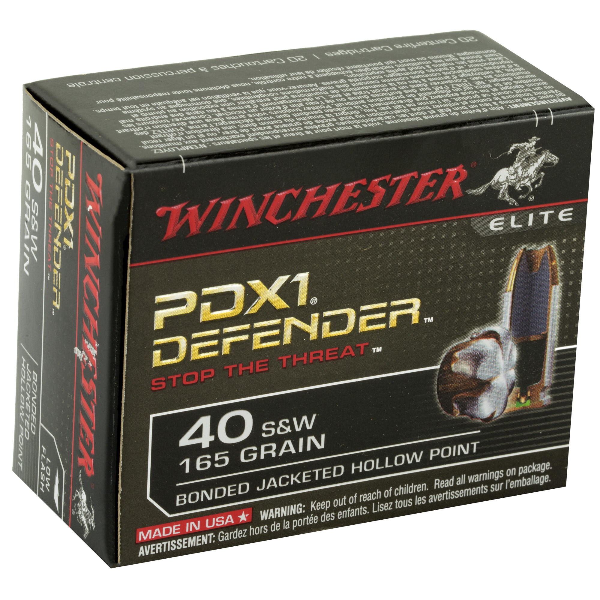 ATTRIBUTES: 40 S&W, 165Gr, Winchester Ammunition, PDX1 Defender, Hollow Point, 20, 200