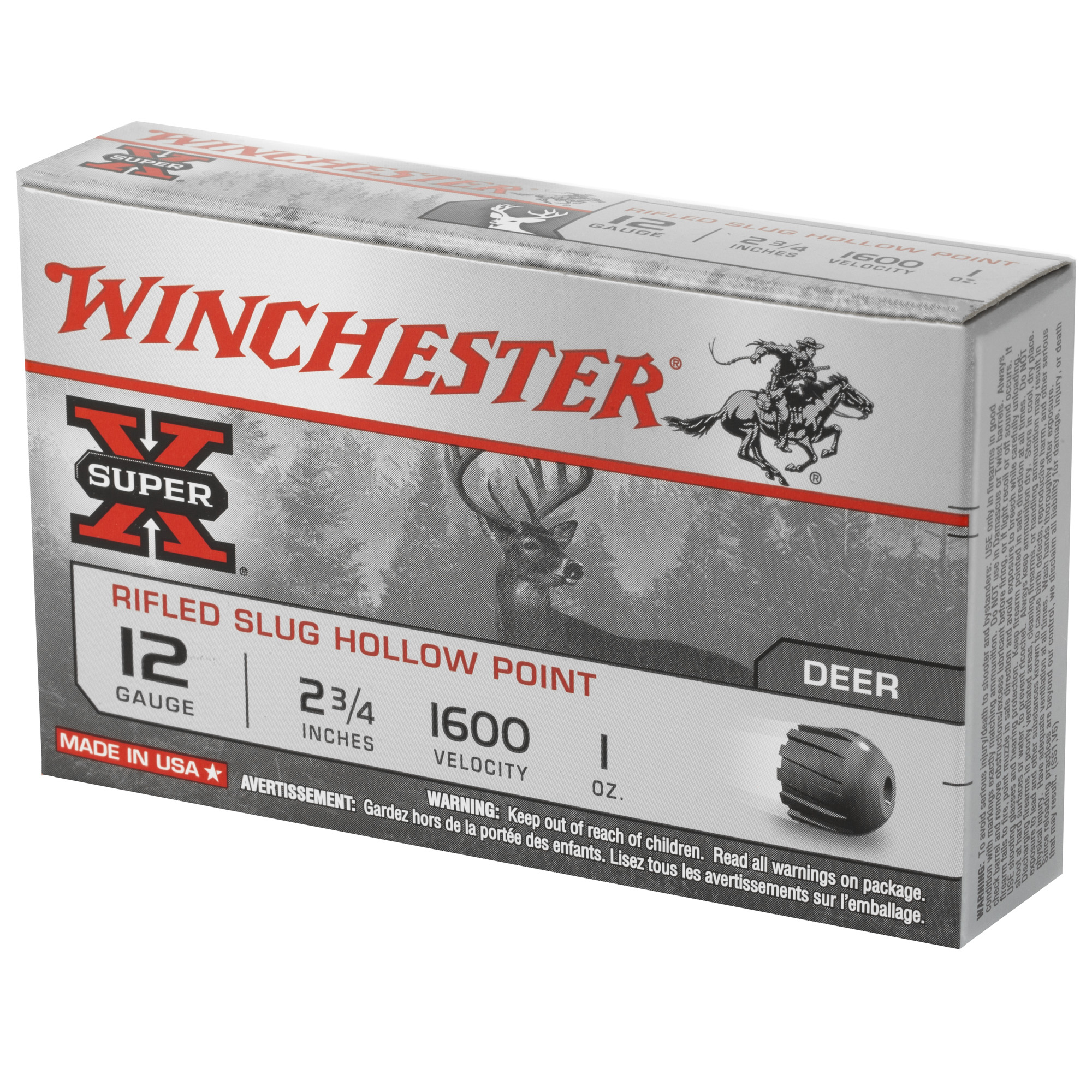 ATTRIBUTES: 12 Gauge 2.75, Winchester Ammunition, Super-X, 1 oz, Rifled Slug, 5, 250