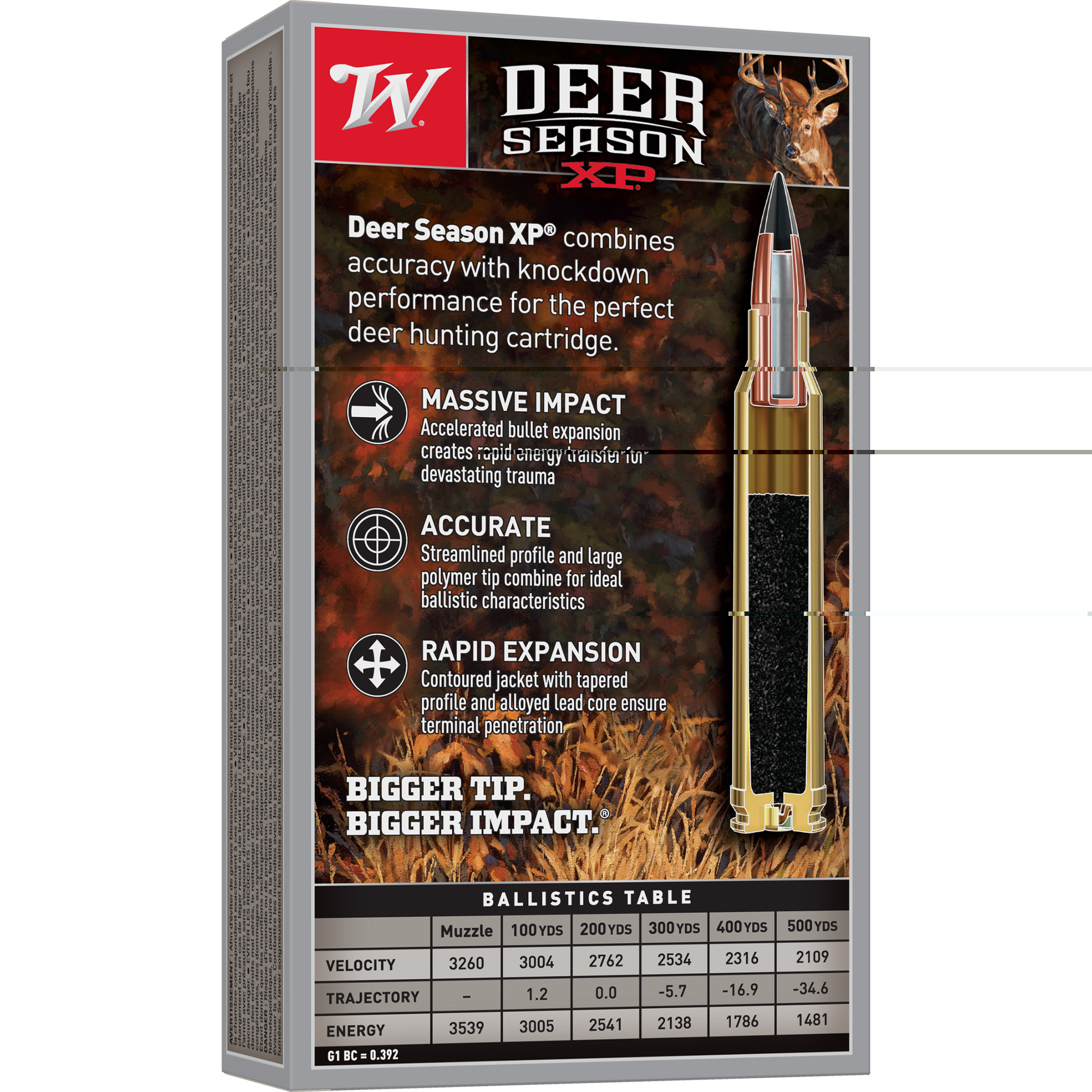 Deer Season XP ammunition combines Winchesters extensive experience into a product engineered specifically for deer hunters. The ExtRemingtone Point bullet features an oversized impact diameter. A bigger impact diameter means more impact trauma, better energy transfer and faster knockdown.
